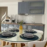 Также из комнаты можно выйти на террасу и оснащённой всем необходимым кухней со всей необходимой кухонной утварью.